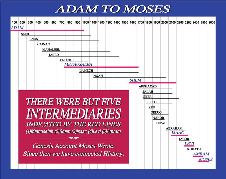 Aside from the fact that it was handed down through the God-fearing family line of Seth, it should be remembered that at that time the bodies, brains and memories of men were not so weak as they are now, and as they have been since the flood. The long lives of two men link Adam with the family of Abraham, the family of covenant favor—with Isaac, the typical seed of promise. These two men were Methuselah and Shem. Methuselah was over 200 years old when Adam died, and had abundant opportunity, therefore, for first hand information. Shem, the son of Noah, was contemporary with Methuselah for 98 years, and with Isaac for 50 years. Thus, these two living, God-fearing men acted as God's historians to communicate his revelations and dealings to the family in whom centered the promises, of which Moses was one of the prospective heirs.