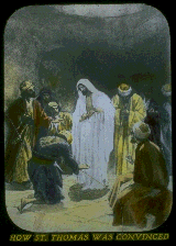 On the following Sunday, Jesus again appeared--in the upper room--St. Thomas being present. He had rebuked his brethren for being too easily convinced that they had seen Jesus, and said that he would not believe unless he felt the print of the nails and the spear wound. Jesus appeared again in a body like that of His humiliation, with the marks of the spear and the print of the nails. He urged Thomas to be convinced, but told of still greater blessings for those who without those proofs were able to fully believe.--John 20:26-29. The Bible tells that Jesus is no longer flesh, but a spirit being, since His resurrection. As St. Paul declares, the Church must all be changed, because "flesh and blood cannot inherit the Kingdom of God." We must all be changed that we may be spirit beings--like Him, which surely means that He is no longer flesh. He was "put to death in flesh, and quickened in spirit," writes St. Peter.--1 Peter 3:18. Jesus appeared to His followers three times on His resurrection day, and five times more during the succeeding thirty-nine days--briefly. This was a part of the great lesson that Jesus was no longer dead, and no longer flesh--that He is "highly exalted."--Philippians 2:9; John 6:62. Saul of Tarsus caught a glimpse of the risen, glorified Jesus, unveiled by flesh, shining above the brightness of the sun at noonday, and the brief glimpse cost him his eyesight. If Jesus had thus appeared to His disciples during the forty days after His resurrection, they would have been alarmed, bewildered, unable to comprehend the matter. St. Paul refers to his glimpse of Jesus, saying, "He was seen of me as one born before the time." His words are explained to mean that all of God's people, the Church of the First-borns, are to be born into spirit conditions by their resurrection. Thus changed they will see Messiah as He is, in His great glory. But Saul saw Him before the time.--1 John 3:2.